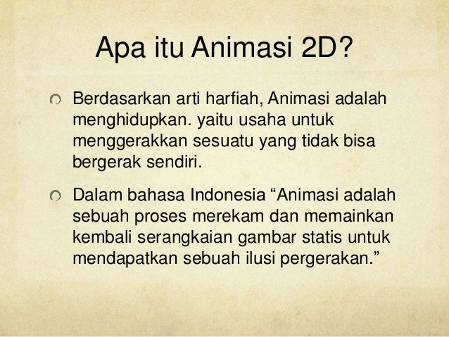 Pengertian Animasi 2D Animasi 2D adalah jenis gambar dua dimensi yang digerakkan secara cepat dan berurutan agar objek terlihat hidup. Pengertian Animasi 2D Animasi 2D Animasi 2D adalah penciptaan gambar bergerak dalam lingkungan dua dimensi. Kartun sendiri berasal dari.